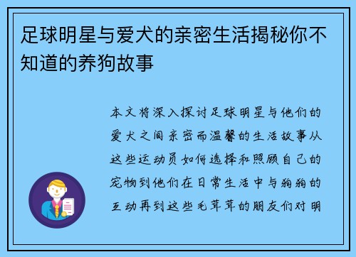 足球这项运动不仅仅是力量与技巧的较量,更是梦想与奋斗的象征。每一位足球明星在赛场上展现出的辉煌成就,背后都有着不为人知的故事和秘密。这篇文章将从四个方面探讨这些足球明星在梦游赛场时所经历的心路历程、心理压力、团队关系以及对于社会的影响。通过对这些深层次话题的剖析,我们不仅能更加了解他们作为运动员的一面,也能看到他们作为普通人的脆弱与坚韧。同时,也希望能激励更多的人追寻自己的梦想。在这个过程中,我们...