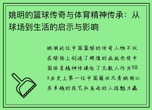 姚明,这位中国篮球的传奇巨星,以其超强的个人数据和辉煌成就,深刻影响了世界篮球的发展。作为NBA历史上第一位来自中国的状元秀,姚明不仅在赛场上展现出了卓越的技术与实力,还成为了中美文化交流的重要桥梁。本文将从四个方面详细探讨姚明的辉煌成就与传奇人生,包括他的职业生涯数据、对NBA的影响、慈善事业的发展以及他在国际篮球舞台上的地位。这些内容将让我们更加全面地理解这位伟大球员所带来的深远意义。...